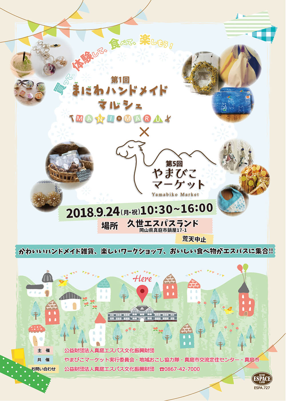 毎年フリーマーケットと同時開催していた、Espace Art Placeをリニューアルしたアートイベントです。今回は真庭市で開催しているやまびこマーケットと合同開催!たくさんのハンドメイド作品販売、飲食などが並びます!