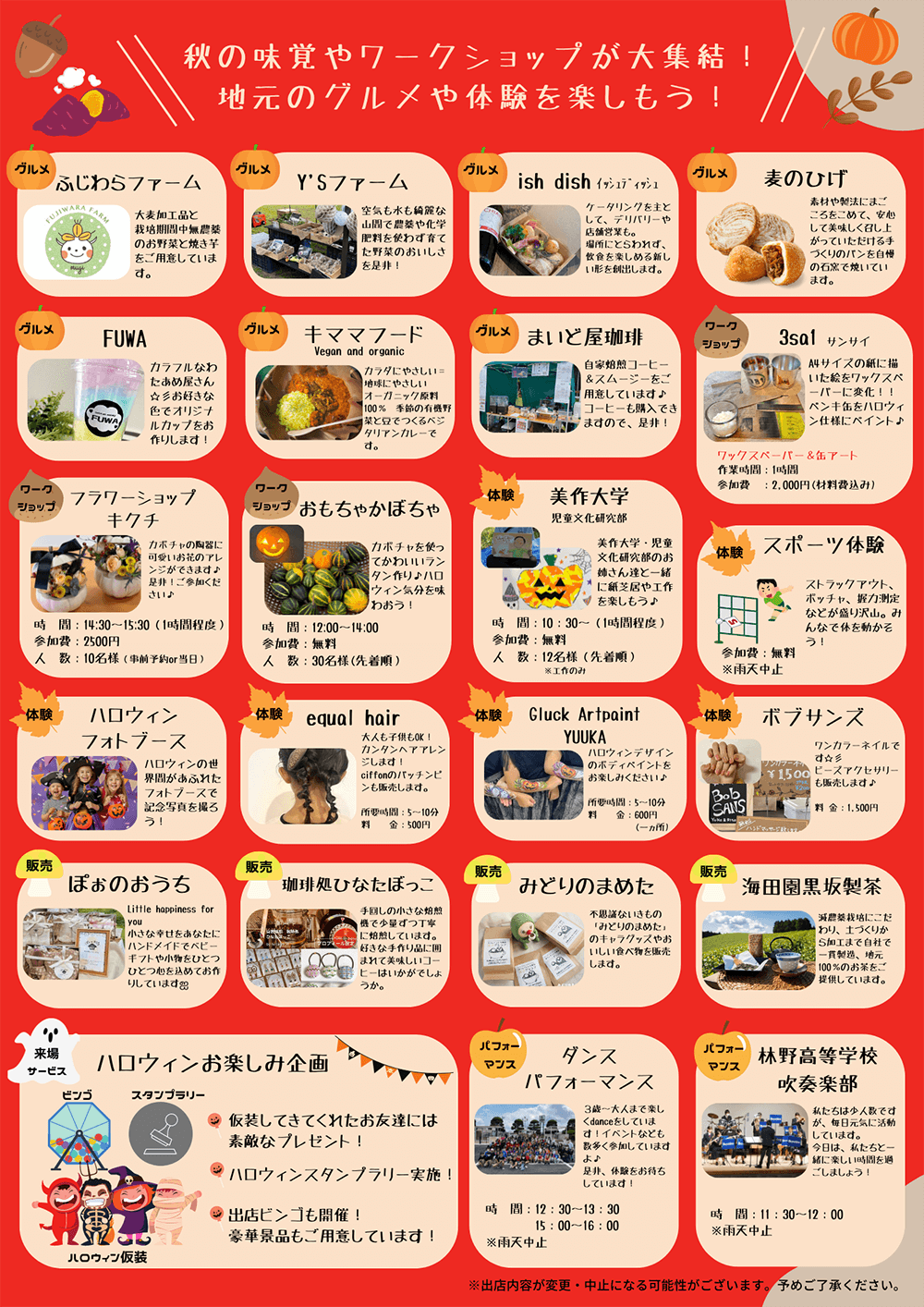 飲食・ワークショップ・体験・ダンスパフォーマンスや吹奏楽部の演奏もあります!